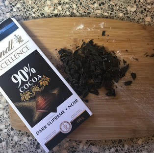 5. Next, using a sharp knife cut the chocolate into small pieces, again similar in size to a raisin and place into the bowl with the dates